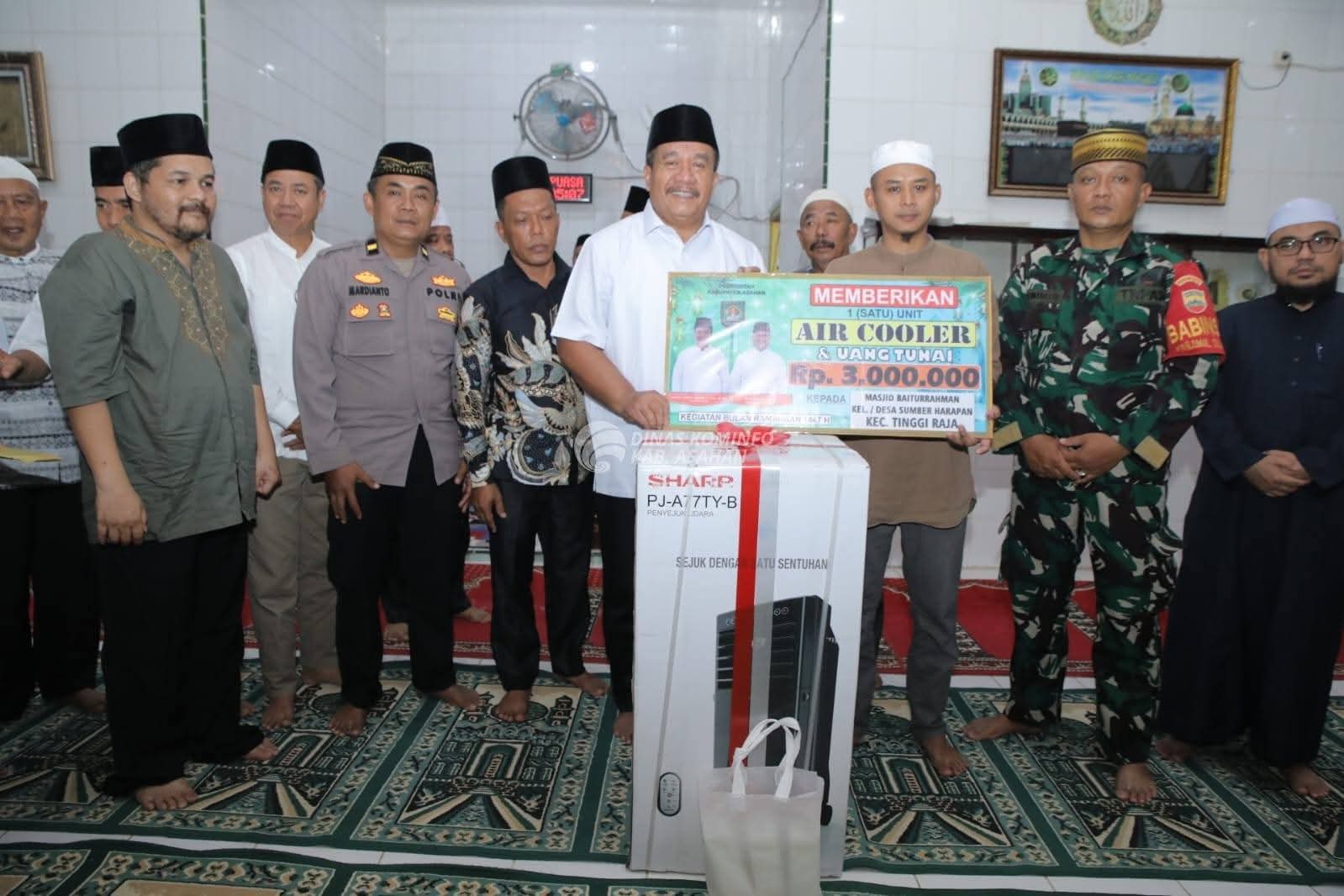 Di Desa Sumber Harapan, Bupati menyerahkan bantuan kepada Masjid Baiturahman. Bantuan tersebut berupa satu unit air cooler dan uang tunai sebesar Rp3.000.000.