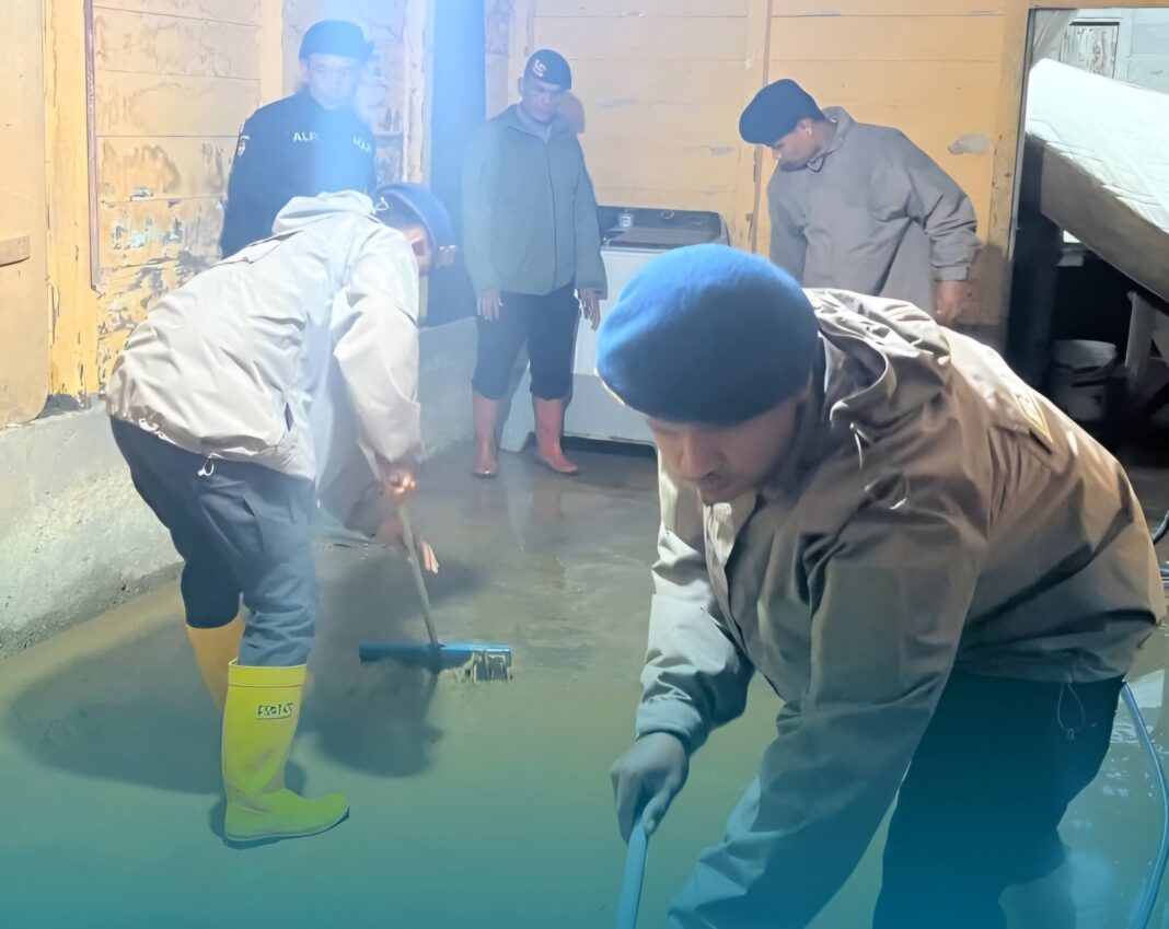 Aceh Tengah—-Personel Polsek Bintang Polres Aceh Tengah bersama personel BKO Brimob Polda Aceh bergerak cepat membantu warga terdampak banjir susulan akibat curah hujan tinggi di wilayah Kecamatan Bintang, Kabupaten Aceh Tengah, Provinsi Aceh, Rabu malam (18/2/2026) sekira pukul 21.00 WIB.
